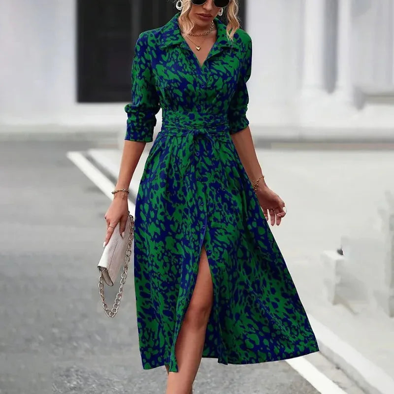 Vendor:Bazarre MartAbstract Print Collared V-Neck Belted Midi Dress