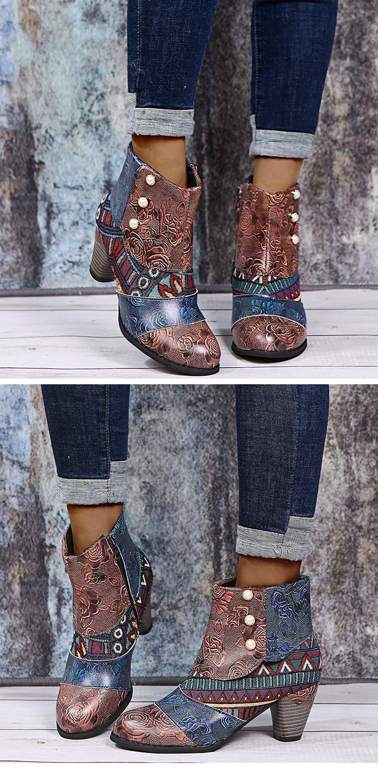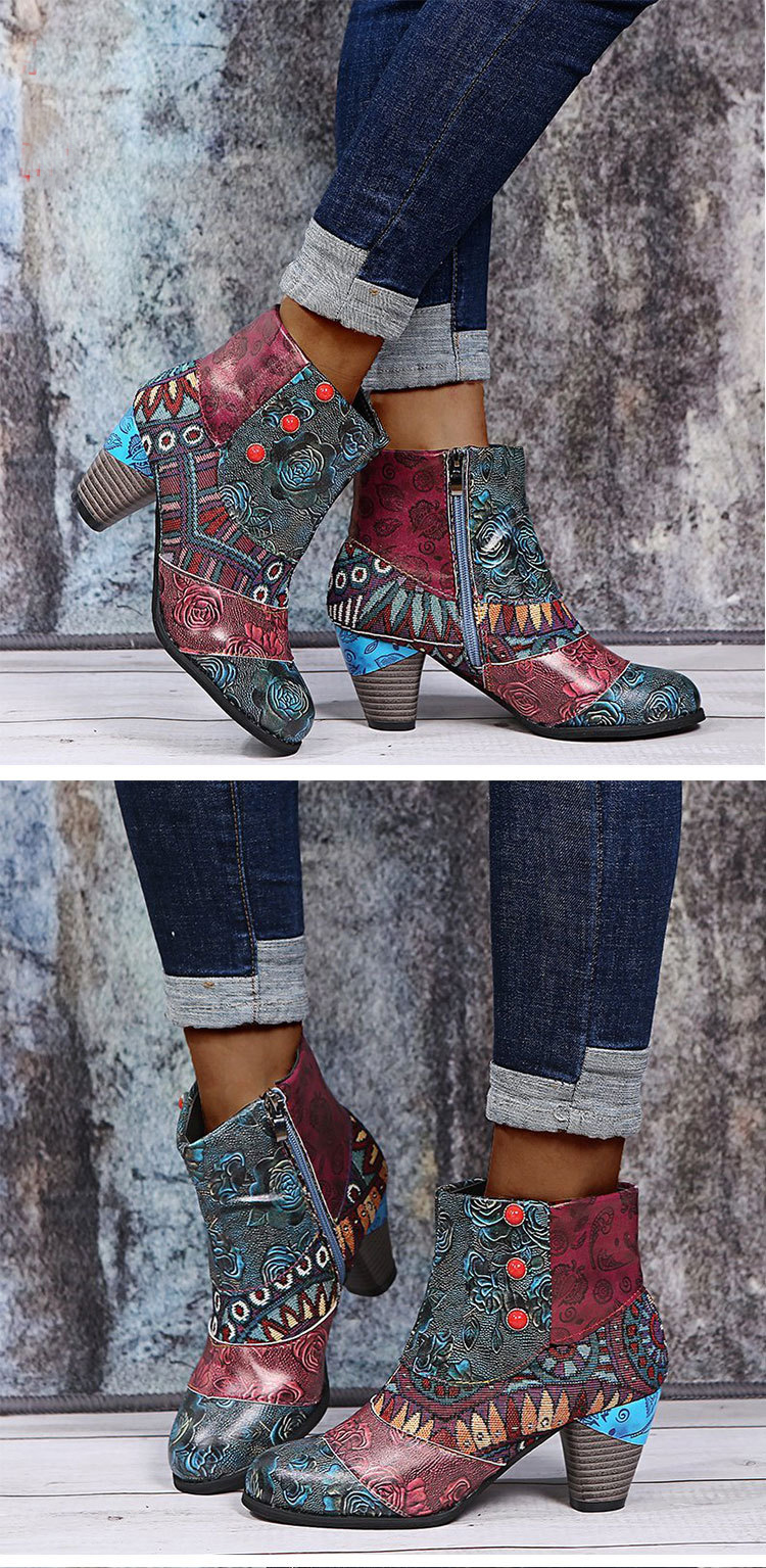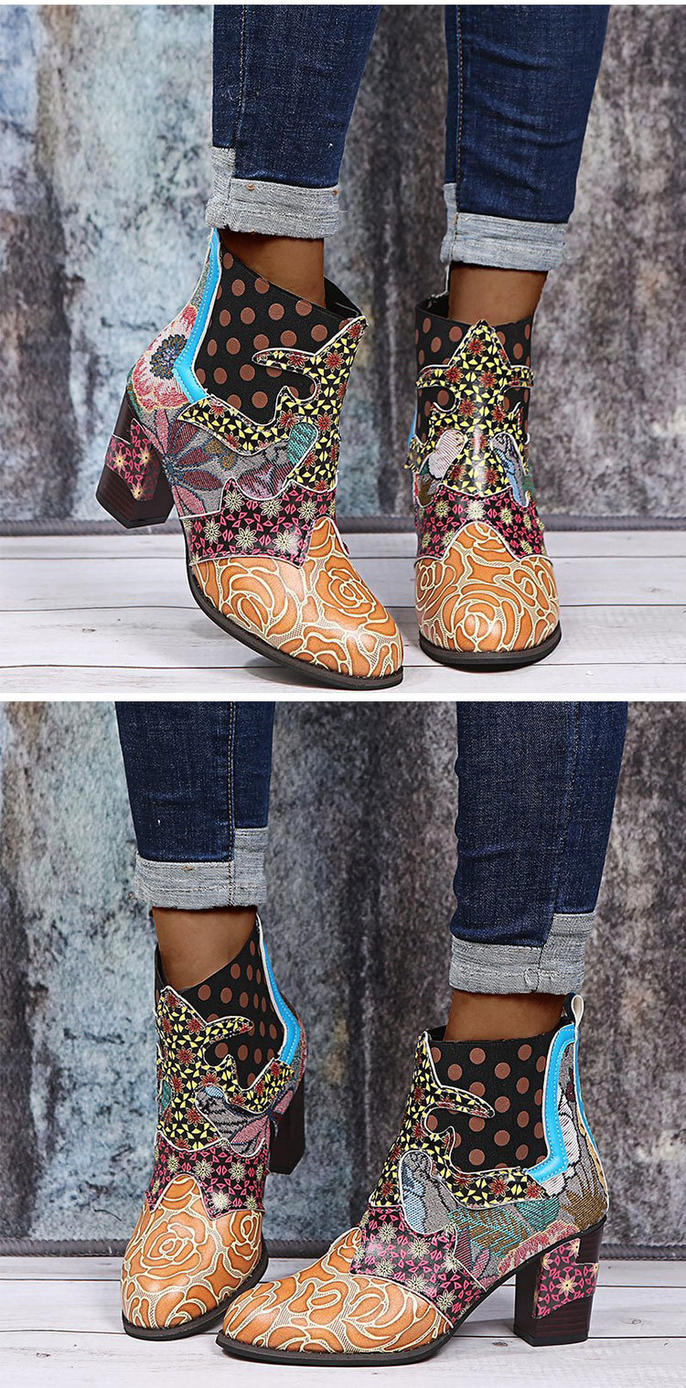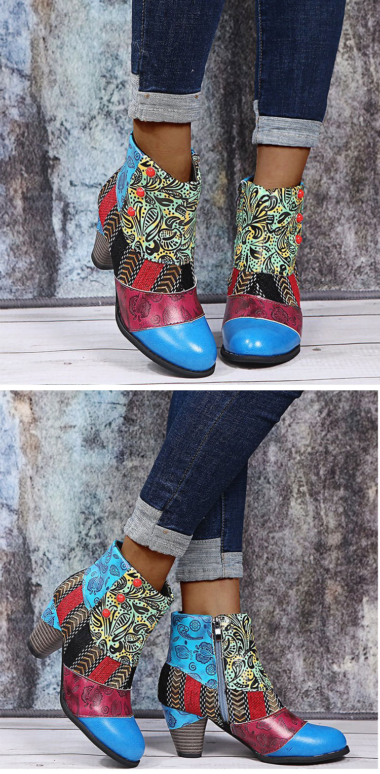 Boho Print Ankle Boots Chunky Mid Heel Boots Women Side Zipper Shoes