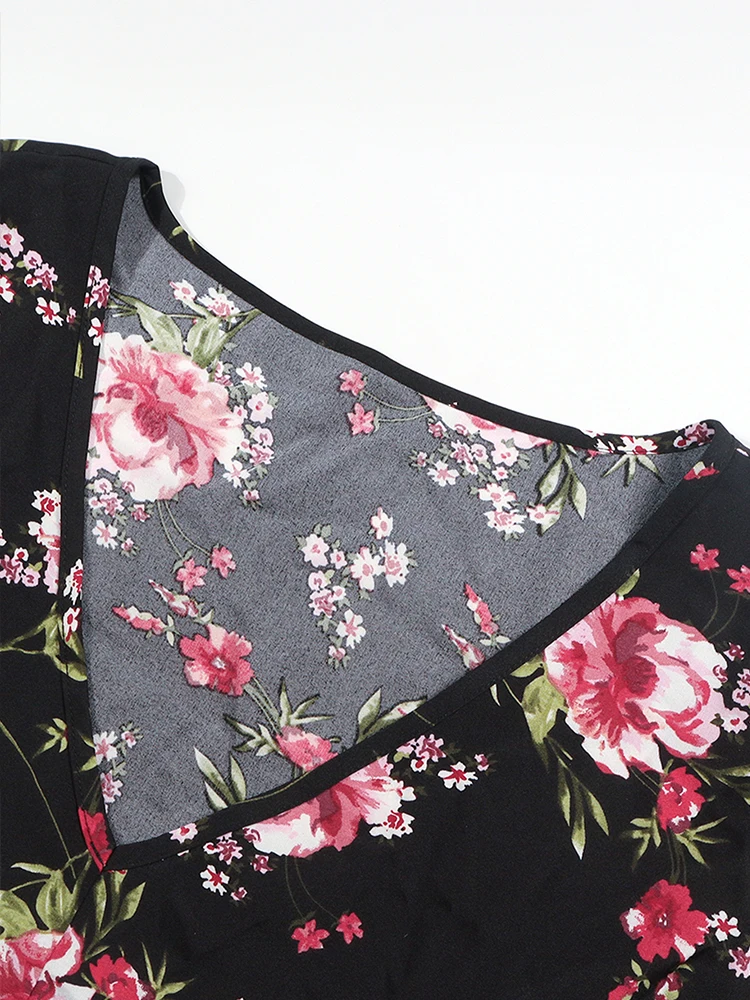 Elevate your wardrobe with this stunning black midi dress that's equal parts bohemian charm and timeless elegance. Featuring a gorgeous floral print, flattering V-neckline, and romantic lantern sleeves, this piece transitions effortlessly from beach days to cocktail nights. The relaxed fit and natural waistline offer comfort without compromising style, while the slight stretch fabric moves with you. Perfect for plus-size fashion lovers seeking versatile pieces that celebrate curves and personality. Available in extended sizes (1XL–4XL) with lengths ranging from 124–142cm, this dress is your go-to for any occasion that calls for a little extra flair.