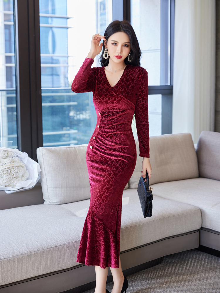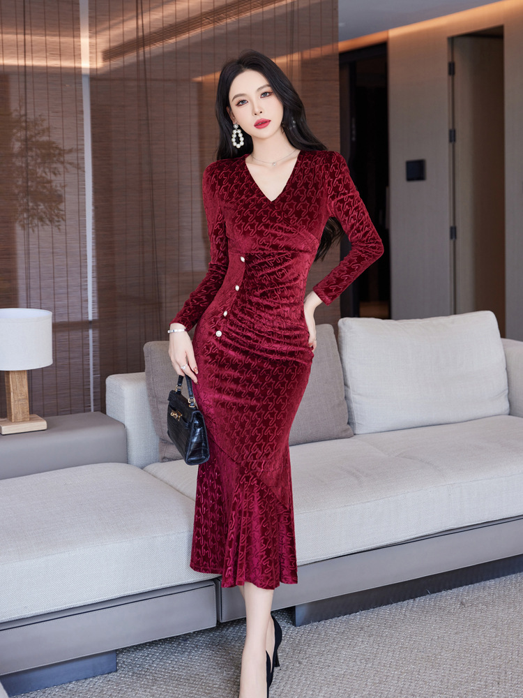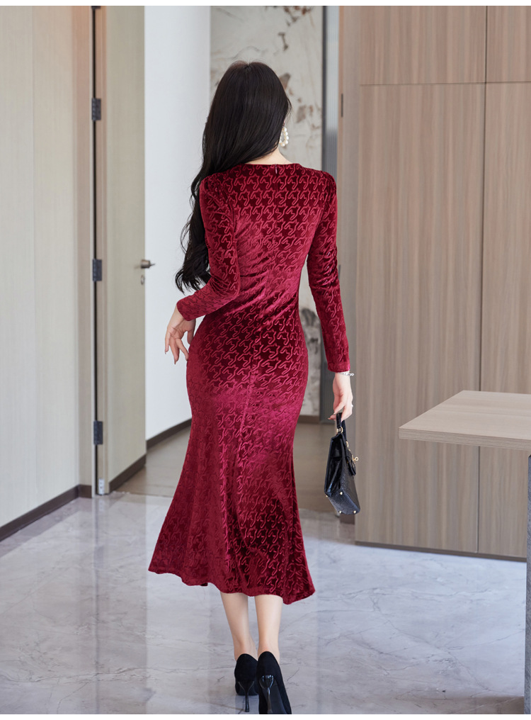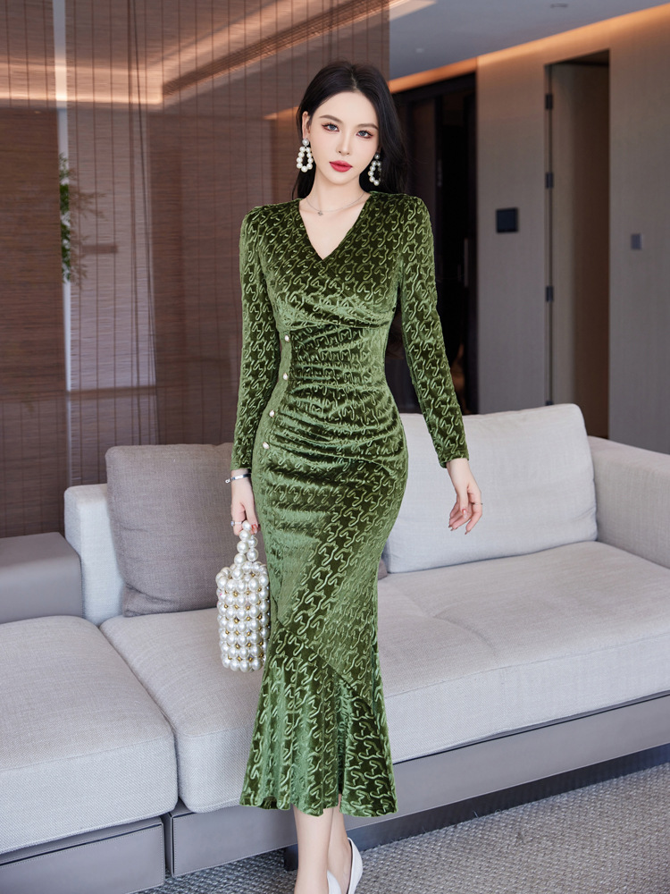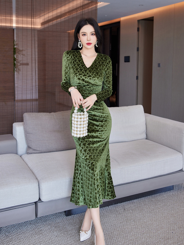 Discover timeless sophistication with this stunning velvet midi dress, expertly designed to flatter your silhouette. The refined V-neckline and high-waisted cut create an elongating effect, while the luxurious gold velvet fabric drapes beautifully into a graceful fishtail hem. Available in rich wine red, classic black, and elegant green, this dress seamlessly transitions from evening events to upscale gatherings. Long sleeves and intricate embossing details add depth and dimension to the sophisticated design. Crafted from premium polyester for comfort and durability, this piece embodies modern elegance with a touch of refined glamour. Perfect for those who appreciate quality craftsmanship and timeless style.