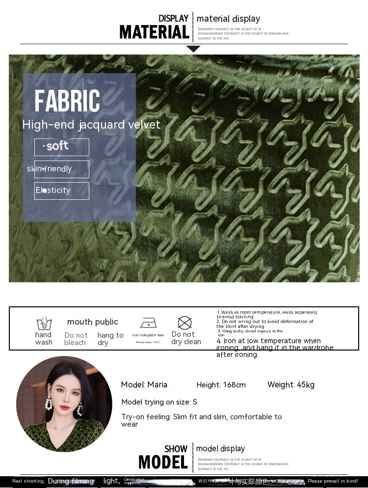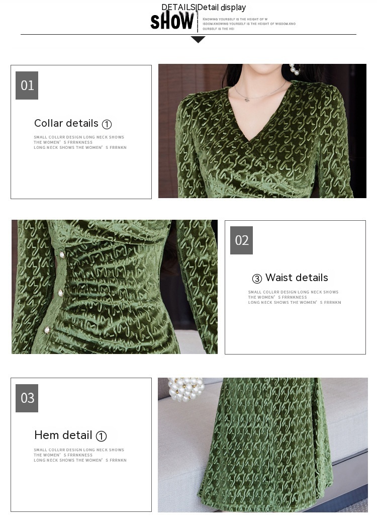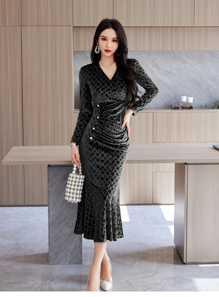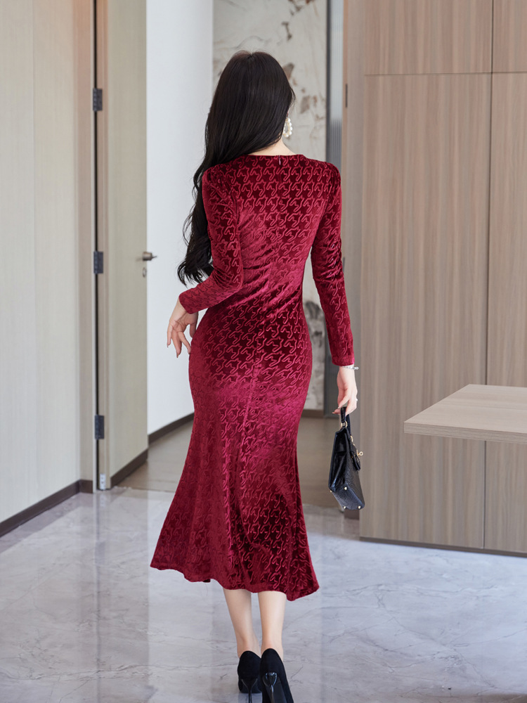 Discover timeless sophistication with this stunning velvet midi dress, expertly designed to flatter your silhouette. The refined V-neckline and high-waisted cut create an elongating effect, while the luxurious gold velvet fabric drapes beautifully into a graceful fishtail hem. Available in rich wine red, classic black, and elegant green, this dress seamlessly transitions from evening events to upscale gatherings. Long sleeves and intricate embossing details add depth and dimension to the sophisticated design. Crafted from premium polyester for comfort and durability, this piece embodies modern elegance with a touch of refined glamour. Perfect for those who appreciate quality craftsmanship and timeless style.