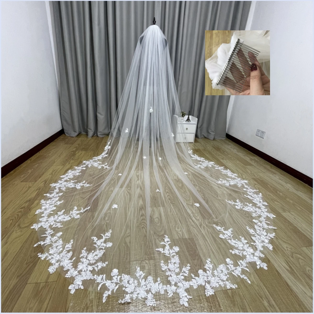 Glide down the aisle in pure elegance with this stunning cathedral bridal veil. Crafted from luxurious 3D soft lace with delicate appliqué detailing, this one-layer veil features a graceful lace edge that catches light beautifully. The secure hand-sewn metal comb keeps everything perfectly in place throughout your big day. Available in ivory and white, with lengths ranging from 2m to 5m, you'll find the perfect fit for your dream wedding look. Brand new and ready to make your entrance unforgettable.