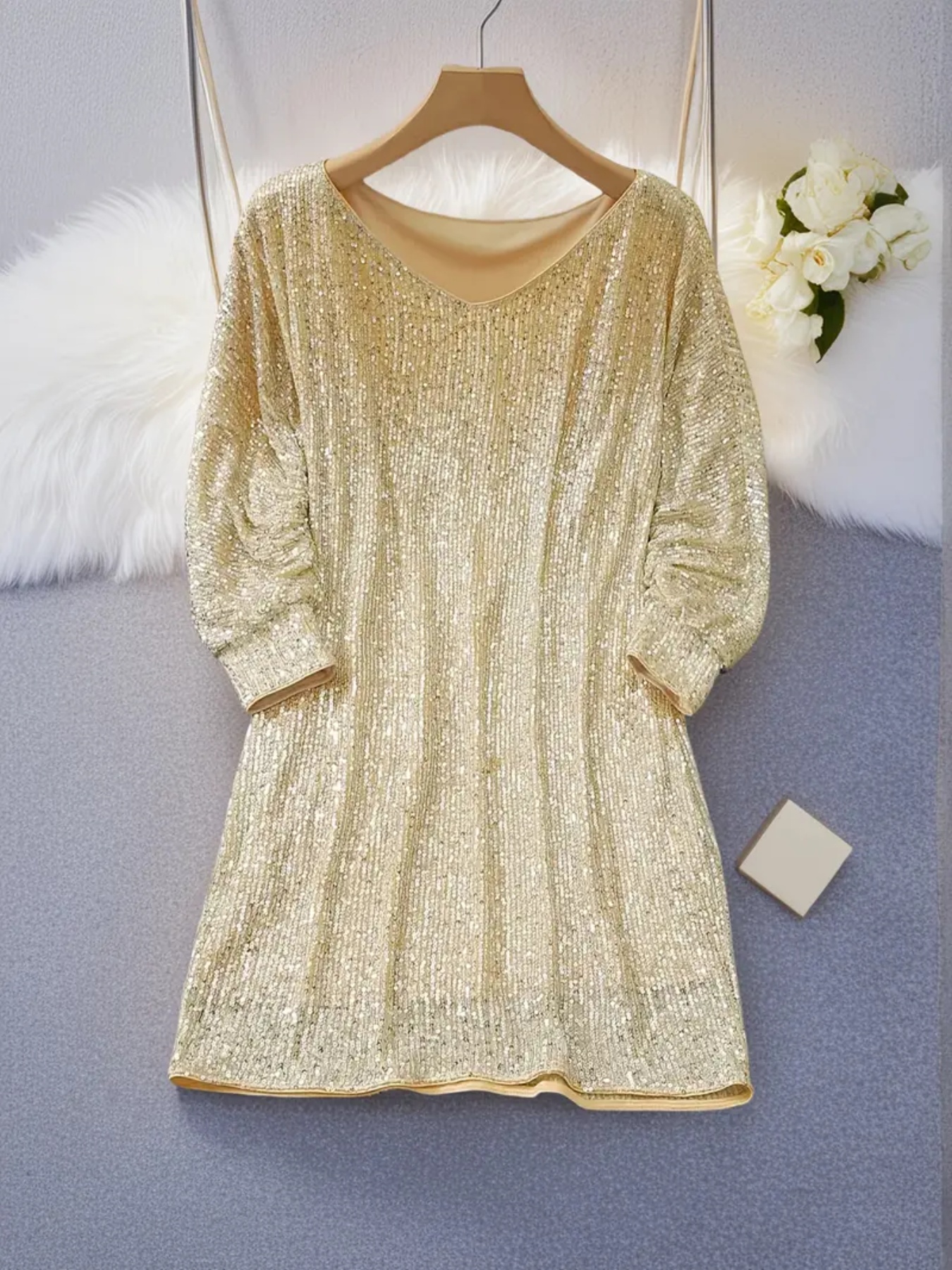 Gold Sequin Bodycon V-Neck Long Sleeve Dress