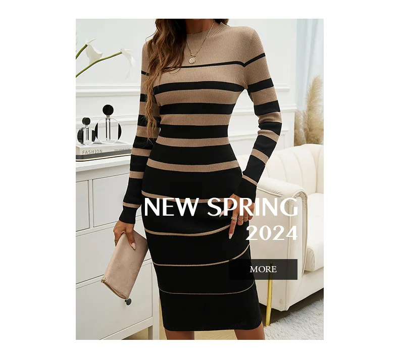 This slim-fit, long sleeve midi dress blends modern style with comfort for the autumn and winter seasons. Featuring a waist-cinching design and a dual-color striped pattern, it highlights your silhouette with subtle stretch polyester and spandex fabric. The high neckline and mid-calf length create an elegant, European-inspired look perfect for casual or semi-formal occasions. Crafted with care from synthetic fibers, this dress offers a flattering sheath silhouette that complements your figure effortlessly. Ideal for women seeking a refined yet comfortable wardrobe addition for cooler weather.