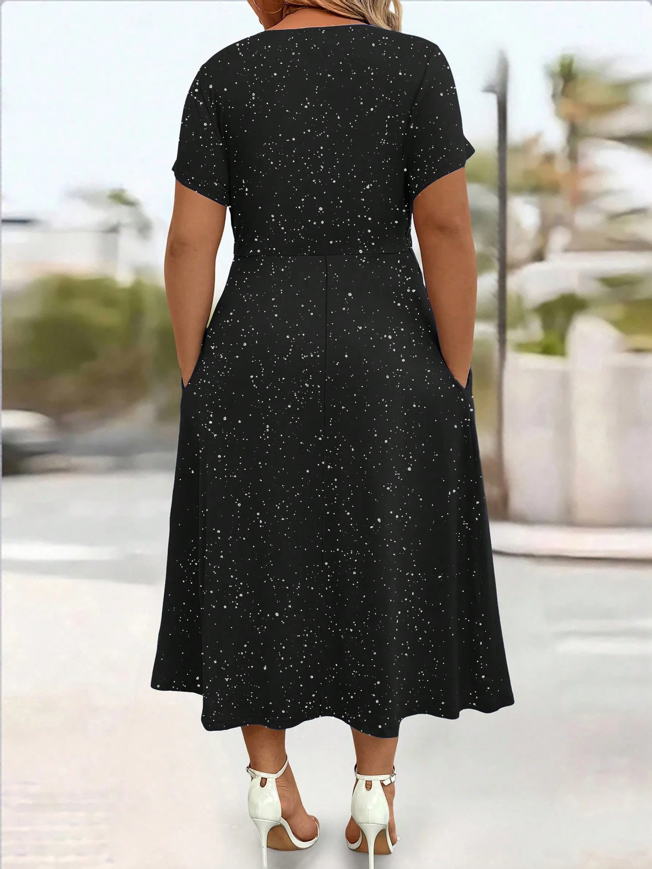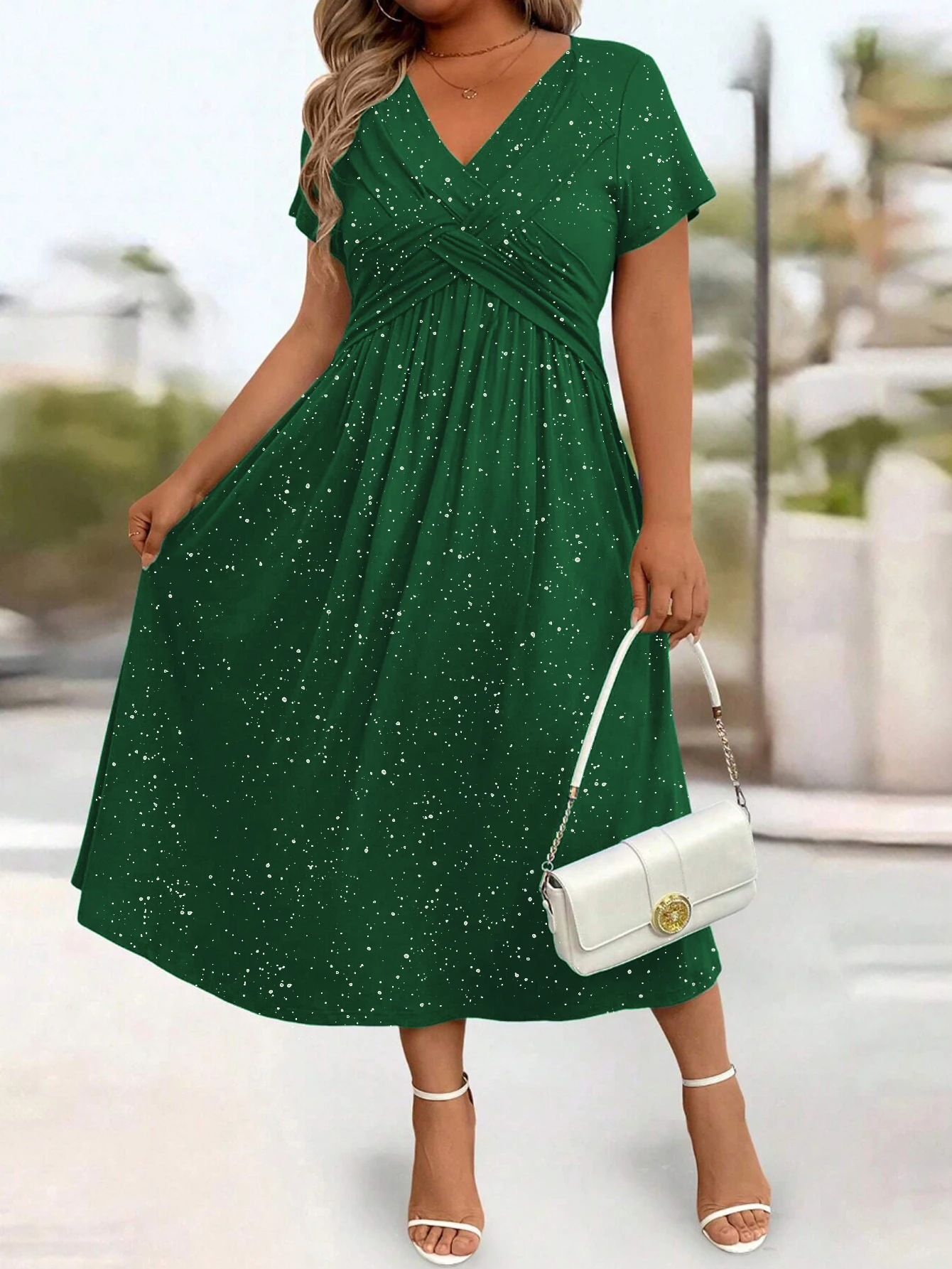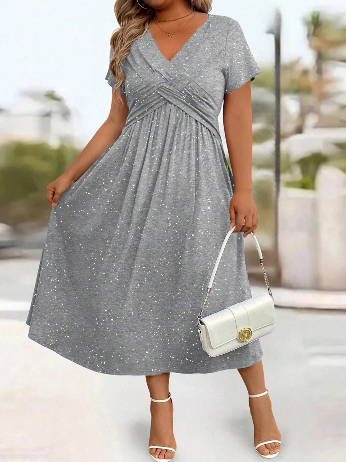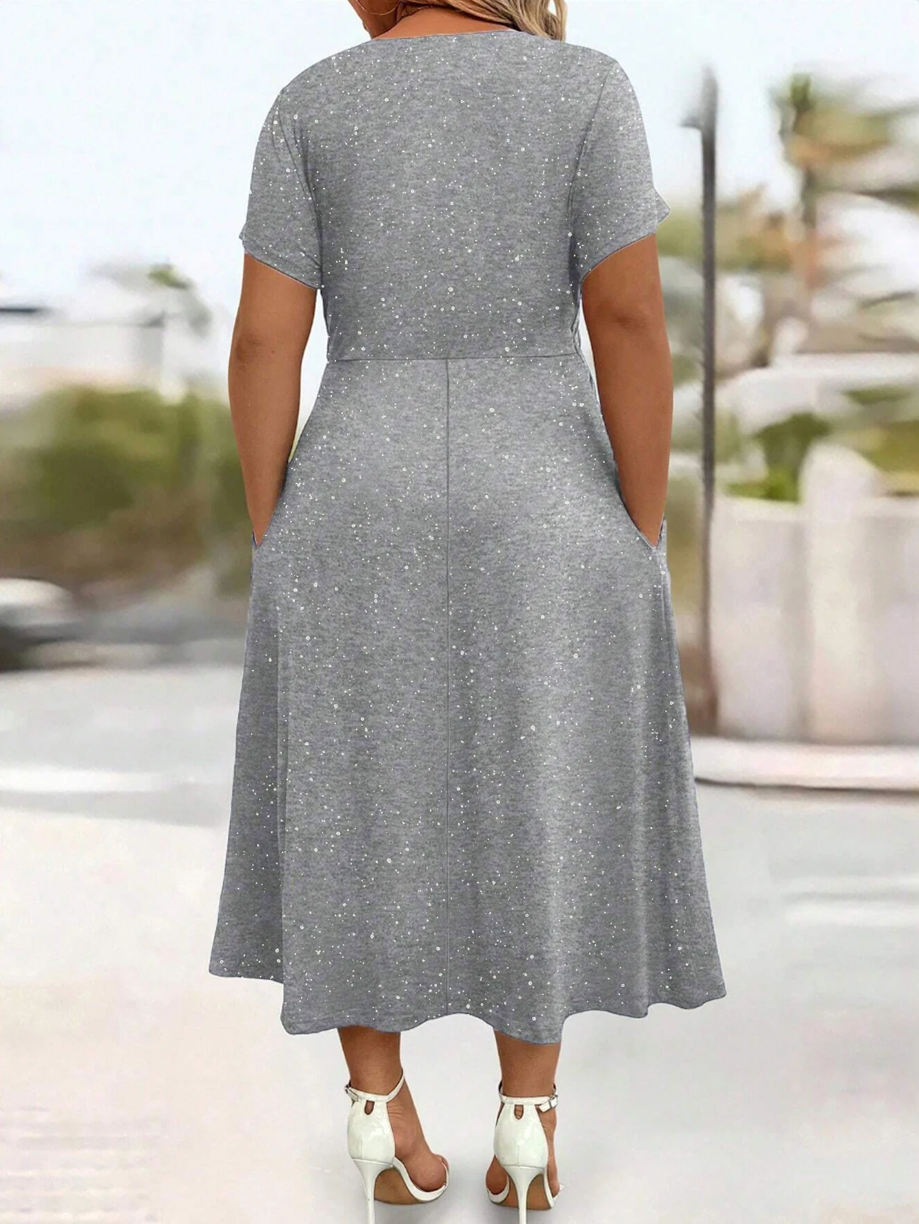 Slip into effortless style with this plus-size V-neck dress that's got all the right moves. The twisted knot detail adds a touch of sophistication, while the shiny powder finish catches the light beautifully. Practical pockets keep your essentials close, and the medium-stretch knit fabric moves with you through spring and summer. Available in five versatile shades—red, black, green, grey, and taupe—this casual essential pairs comfort with just enough shimmer to make you feel fabulous.