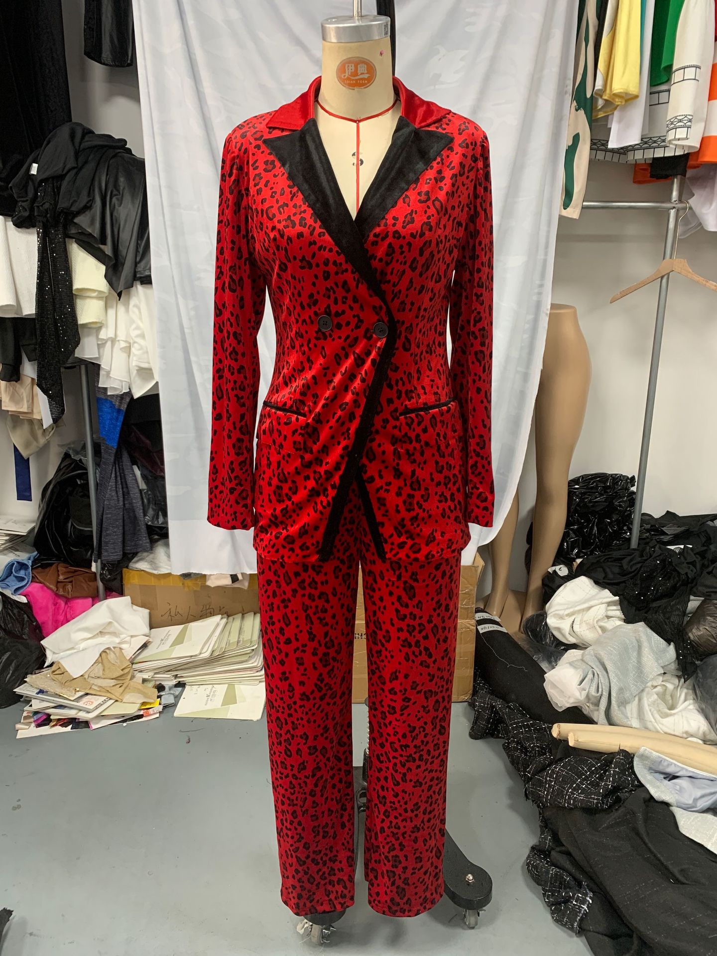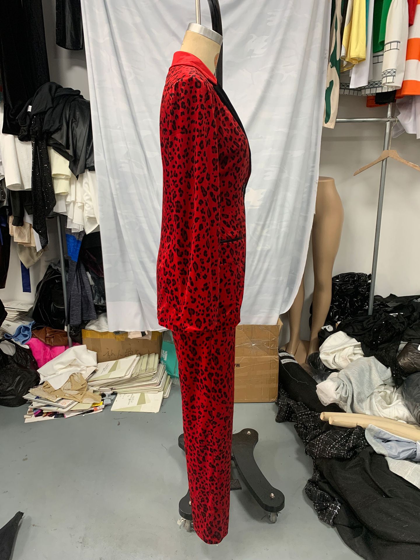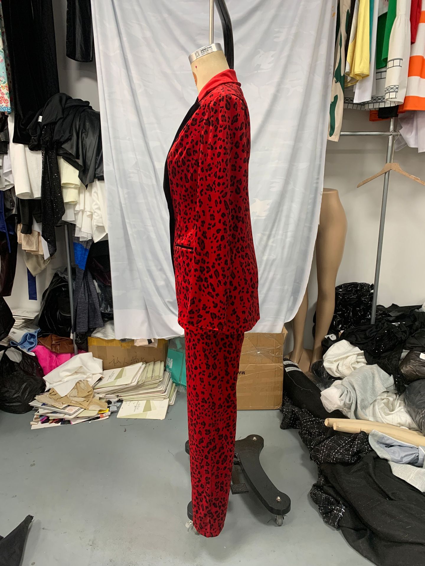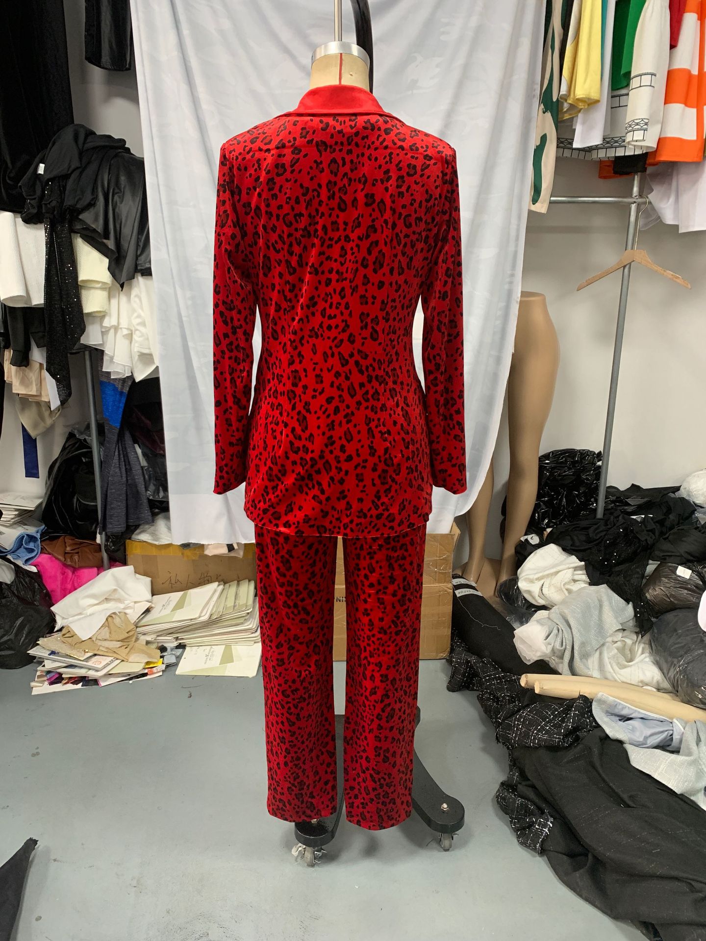 Turn heads and elevate your wardrobe with this striking Red Leopard Pants Suit designed for professional women. Featuring a unique show stopping bold leopard print in red, this business casual set combines style and sophistication. The suit includes conventional long sleeves and tailored trousers, available in sizes S to XXL. Crafted with a tasteful splicing technique, it perfectly balances a confident commute look with refined temperament. Ideal for making a powerful impression while maintaining comfort throughout your day.