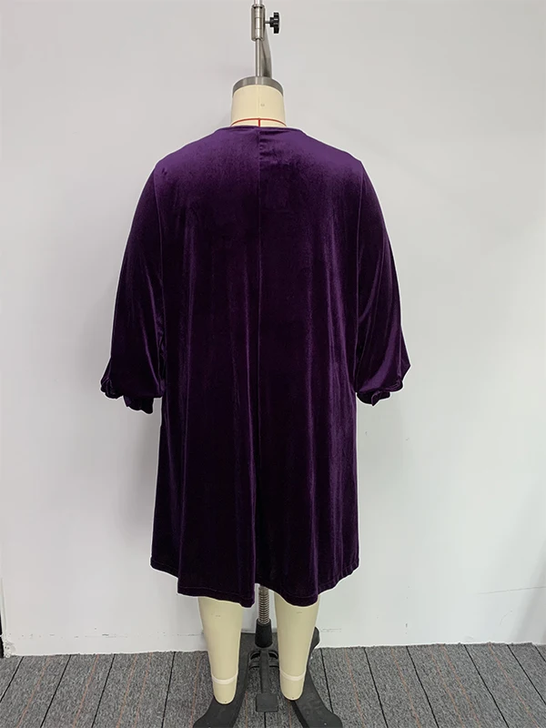 Embrace refined style with this exquisite plus-size velvet dress, a sophisticated choice for winter's most memorable occasions. Rendered in deep purple velvet with commanding long sleeves and ornate gold brooch detailing, this piece exudes quiet confidence and timeless appeal. The generously cut silhouette provides ease of movement while the polyester-elastane composition offers gentle stretch and lasting comfort. Designed for special events and festive celebrations, this dress transitions effortlessly from evening soirées to daytime gatherings. Offered in sizes 1XL to 4XL with graduated lengths—from 49.61 to 56.69 inches—ensuring a polished, proportionate fit for every body.