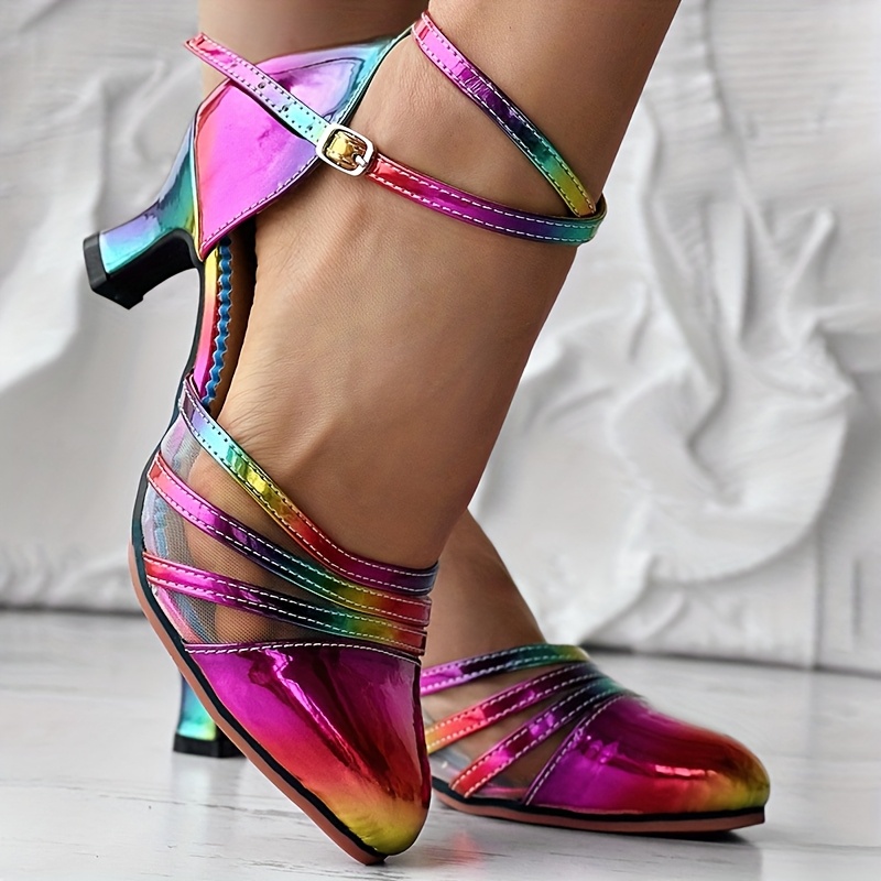 Elevate your look with the Patent Leather Rainbow Gradient or Leopard Cross Buckle Chunky Heel Sandals. Featuring a comfortable mid-height block heel and a round closed toe, these all-season shoes offer both style and support. The fabric inner lining and insole ensure lasting comfort, while the durable rubber sole provides stability. Available in sizes 6.5 to 10.5, these sandals are crafted with man-made materials in Guangdong, China, combining bold patterns with reliable wearability.