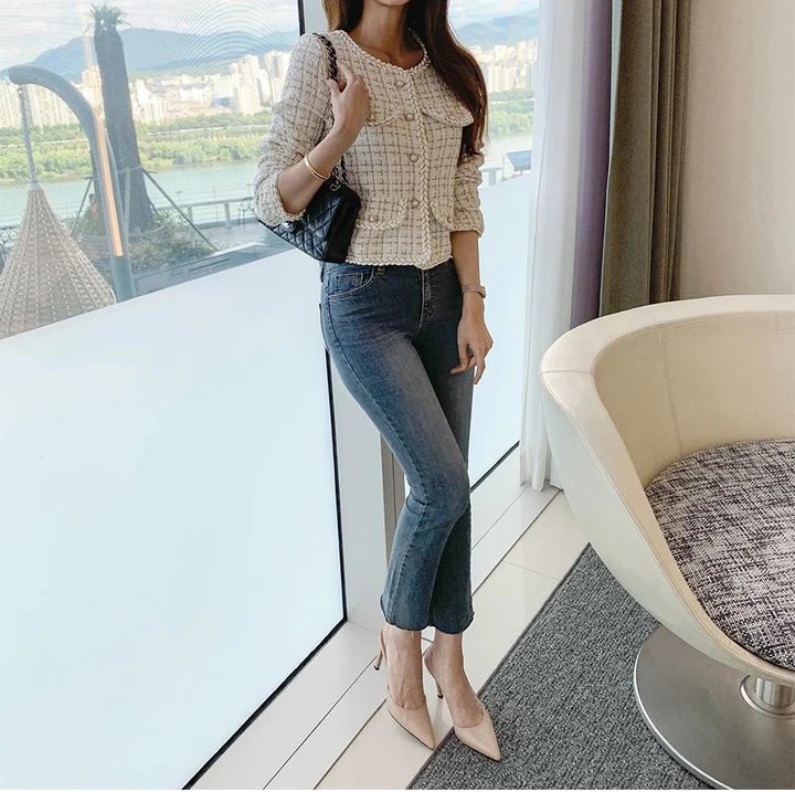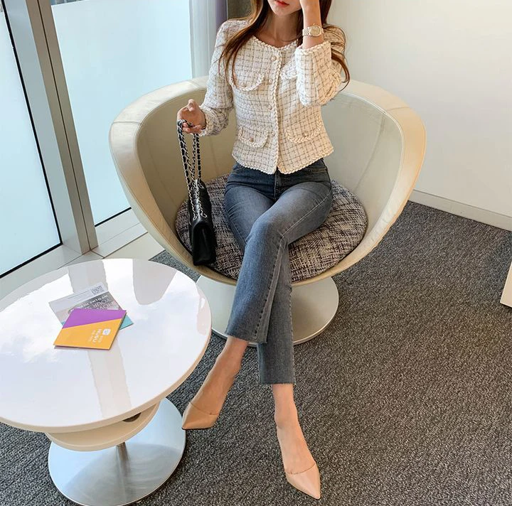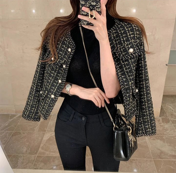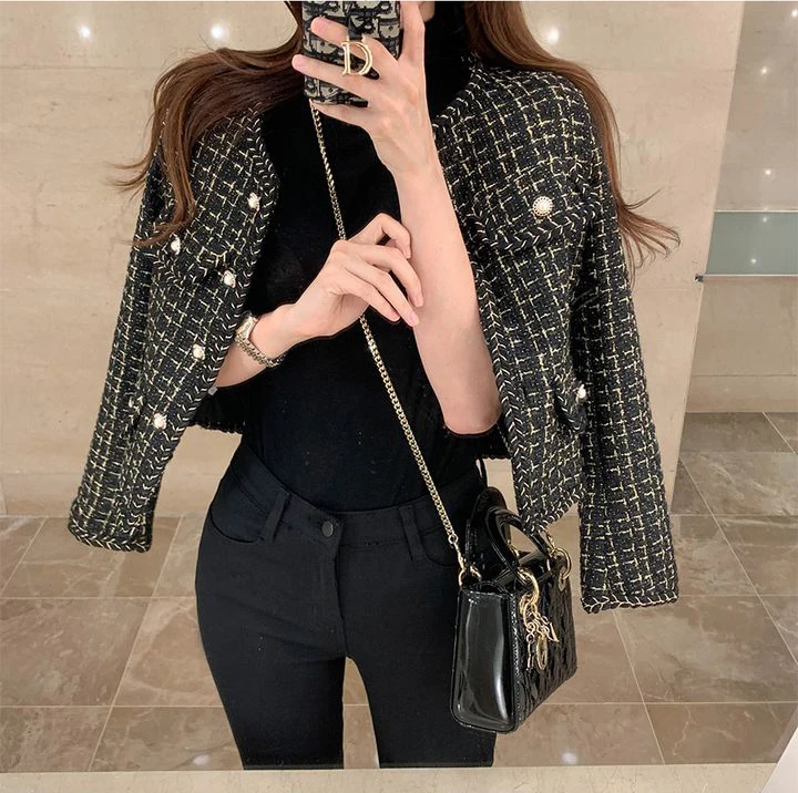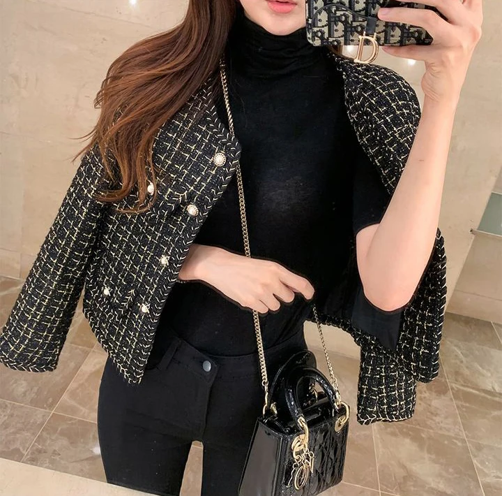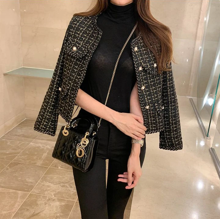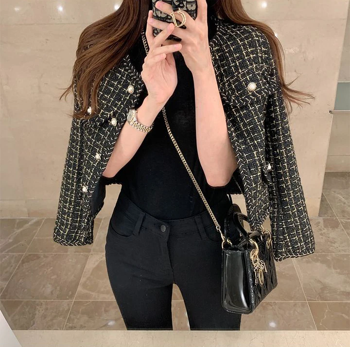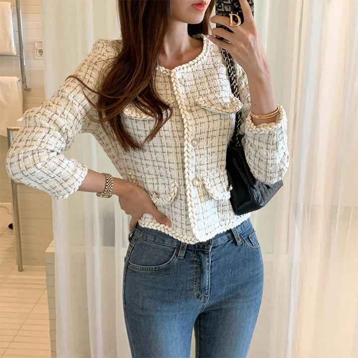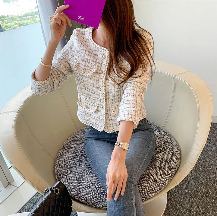Bring back the glamour with this delightfully retro tweed jacket that's giving major vintage vibes. Featuring a sophisticated round neckline and single-breasted front closure, this piece is adorned with elegant pearl buttons that catch the light beautifully. The thick, yarn-dyed polyester boucle' fabric boasts a charming lattice pattern reminiscent of iconic Chanel designs. Stay dry thanks to the waterproof canvas shell, while four patch pockets keep your essentials close. Long sleeves and a relaxed regular fit make layering a breeze, whether you're dressing up or keeping it casual. Available in crisp white or classic black, this one-size-fits-most jacket is your ticket to effortless, timeless style.