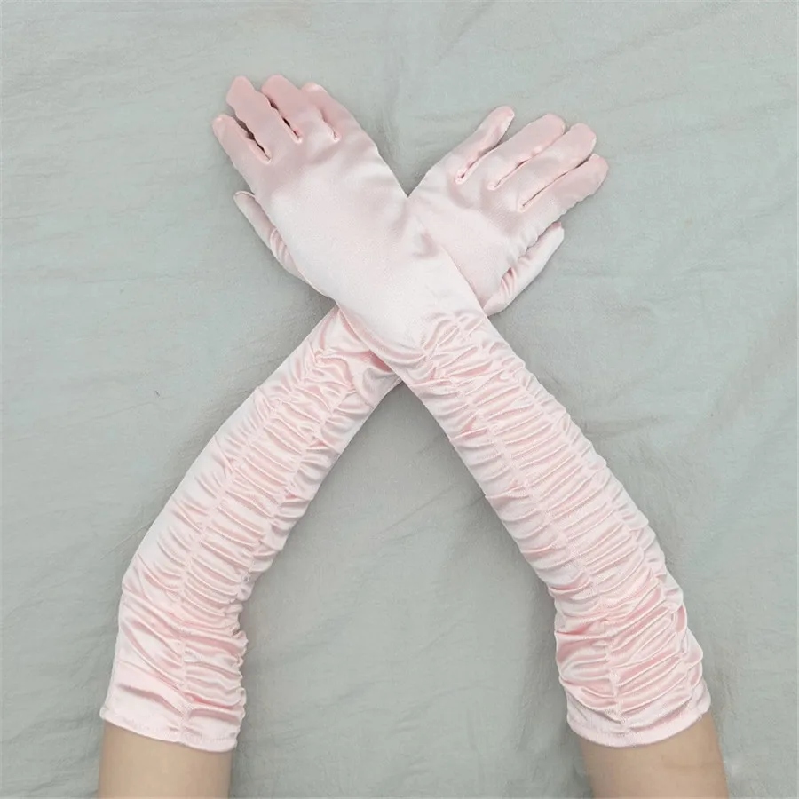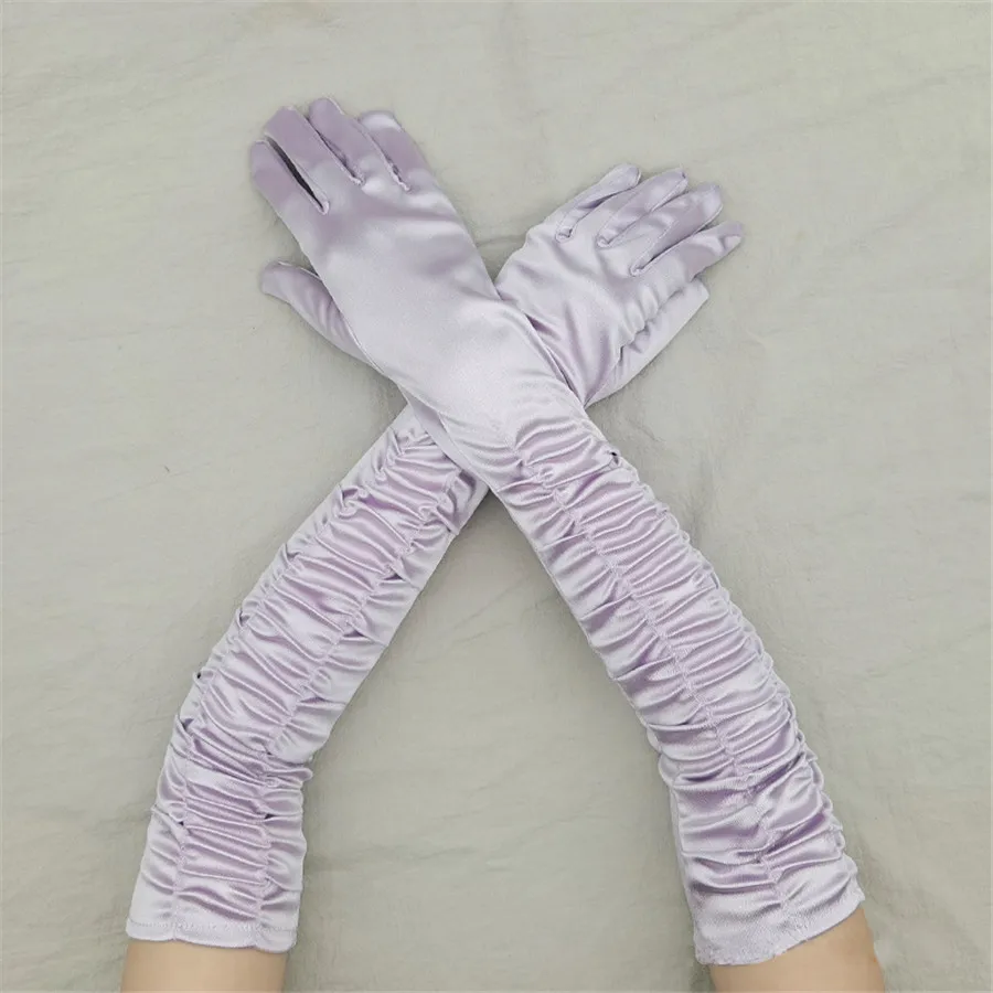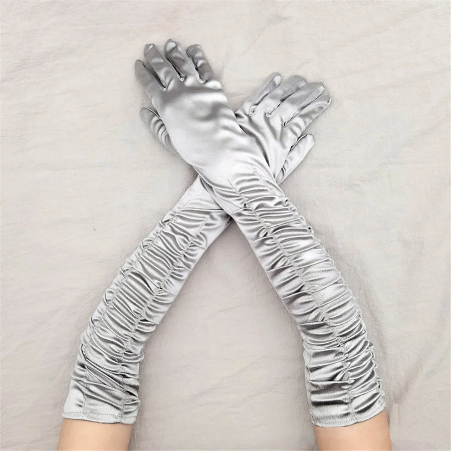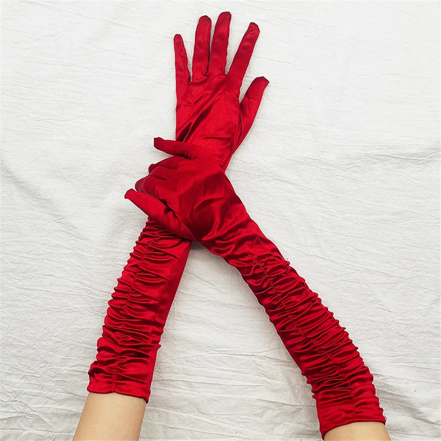 Elevate your formal ensemble with these audacious satin pleated opera gloves. Crafted from a luxurious blend of acrylic, polyester, and elastane, they deliver a silky-smooth touch with just enough stretch for comfortable wear. The classic opera length and elegant pleated design channel timeless sophistication, while the cinched elasticity ensures a secure fit through evening events, performances, or ceremonial occasions. Available in sixteen stunning hues—from bold jewel tones like royal and lavender to versatile neutrals—these gloves make a statement whether you're commanding the stage or commanding the room. Perfect for anyone ready to embrace retro glamour with modern edge.